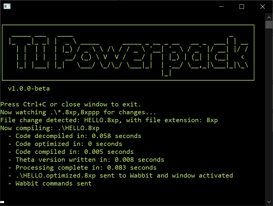 Auto-run: If WabbitEmu is detected, it will attempt to load the 8XP into the emulator and press the ENTER key in the emulator to re-run it.