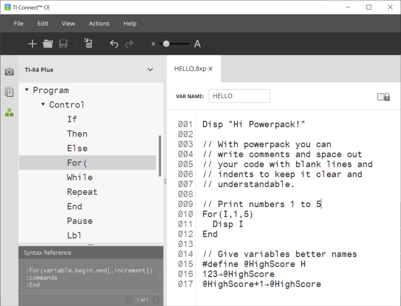 Write your TI Basic code in TI Connect CE (or your favourite code editor), run Powerpack.exe, and have the resulting file ready for loading onto your calculator or emulator: